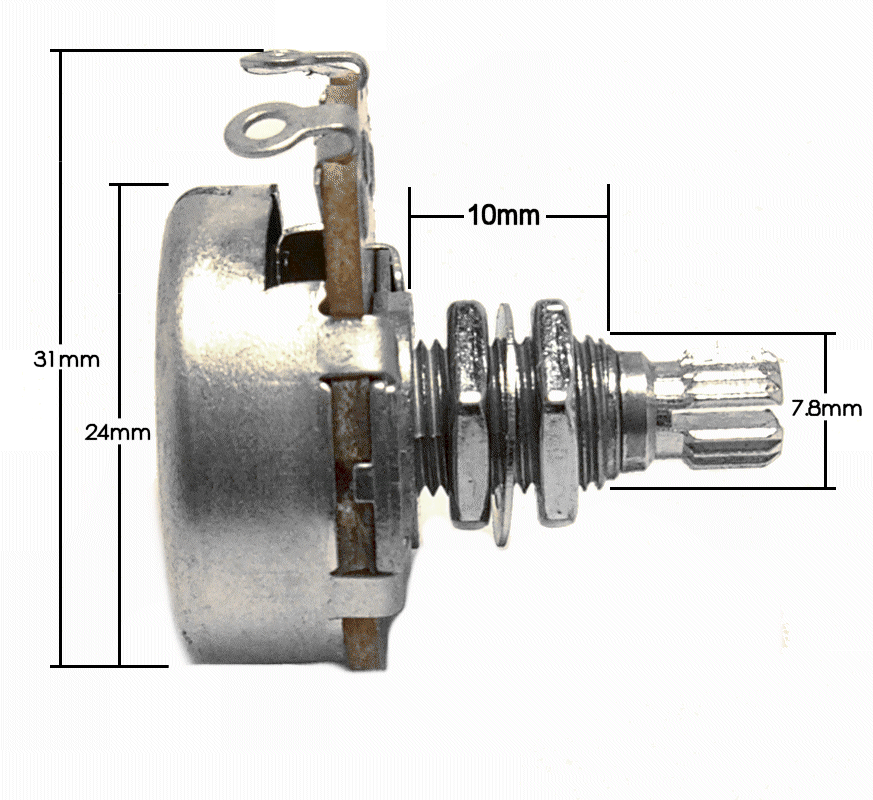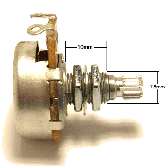 Note: These pots feature a more robust 9.5mm diameter collar. This may require the holes in your guitar/scratchplate to be "eased" slightly with a some rolled sandpaper (very easily done!). They are compatible with all knobs on our Knob page. (i.e. Standard 6mm, 18 spline, split-shaft).
