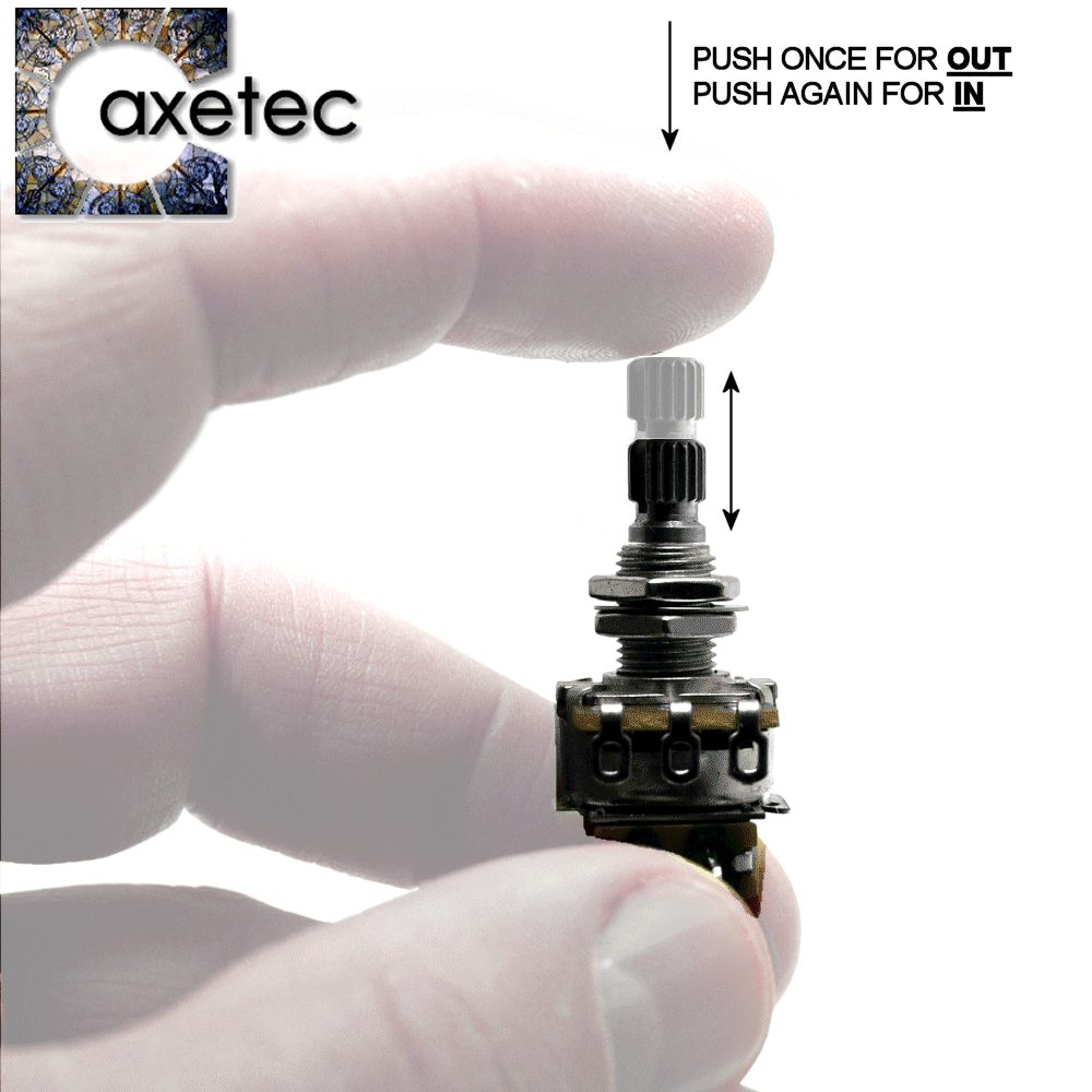 These pots are superb in operation and much slicker to operate (especially when playing live!). One push brings the switch to the "out" position, a second push toggles to the "In" position. No more sweaty fingers slipping off tapered knobs!