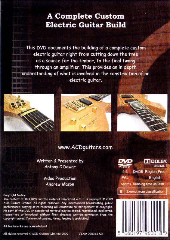 This is the first DVD of its kind to hit the market! We all know that Brian May built his own electric guitar (and what a success that was!), well this is how one builder, over a three year period, revisited his 1980s guitar building experiences and made a guitar using a cherry tree from his own garden. The resulting DVD, which lasts for nearly 3½ hours, is an enthralling, educational and inspirational watch for young and old alike. Everything is shown from cutting down the cherry tree through to playing through an amplifier.