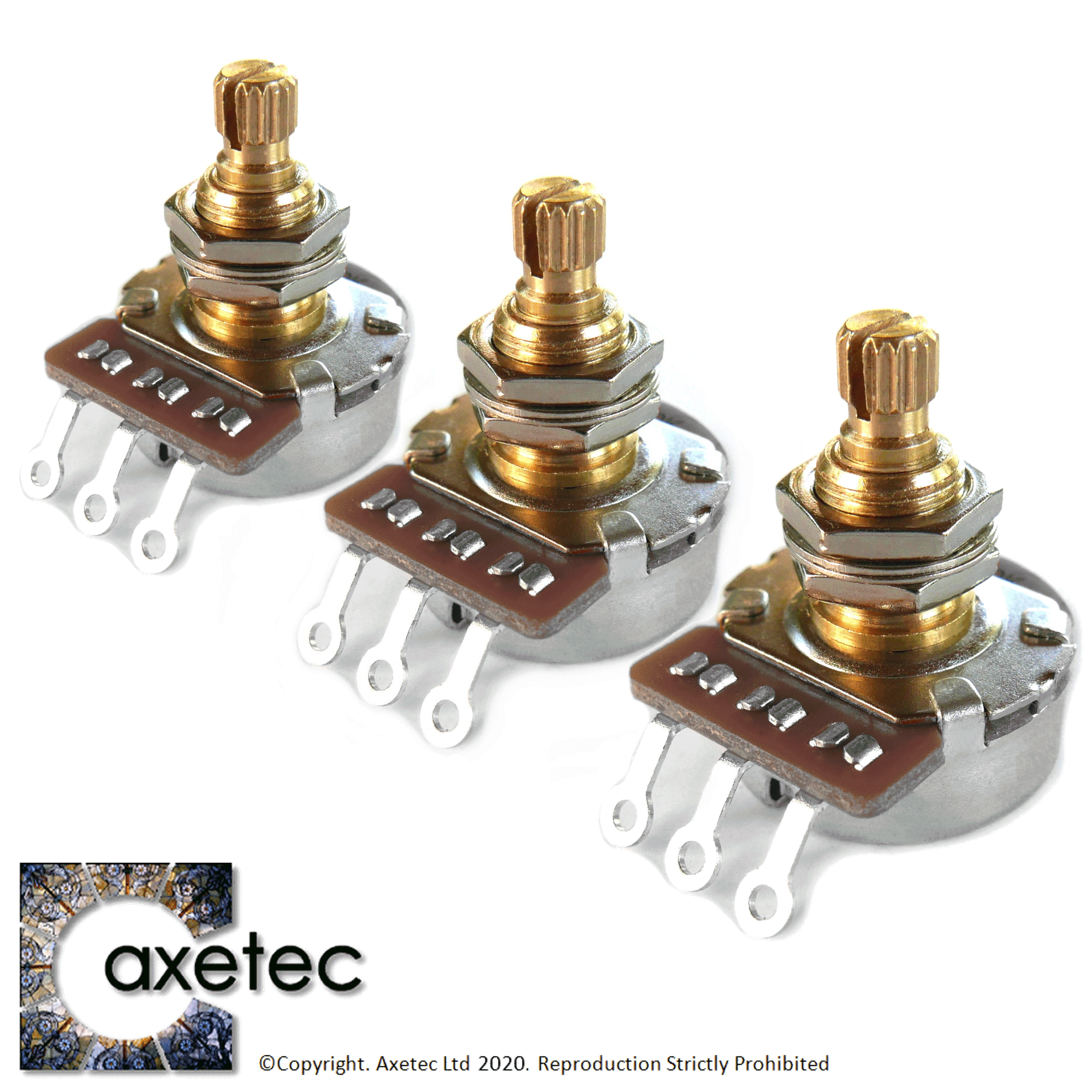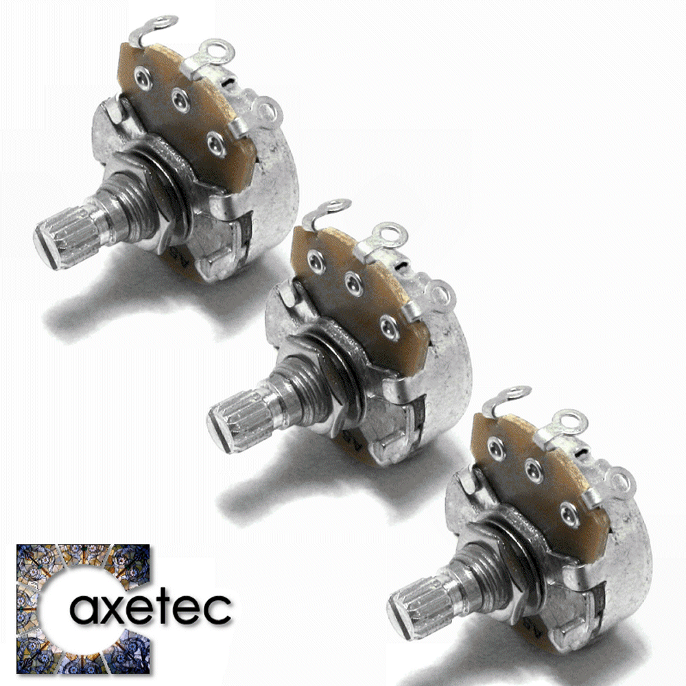 3 x superior quality pots. 10mm collars - suitable for mounting on scratchplates drilled with 9.5mm or 10mm diameter potentiometer holes.