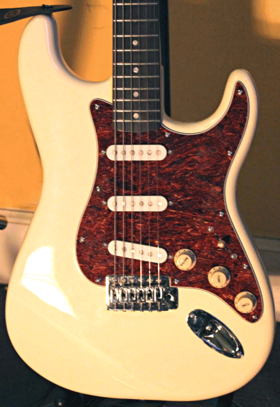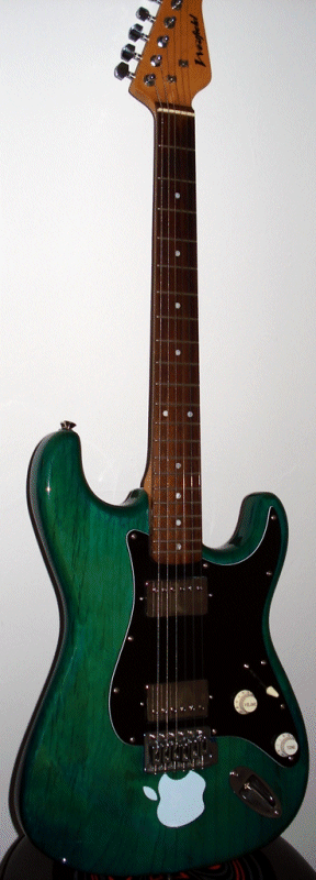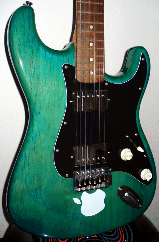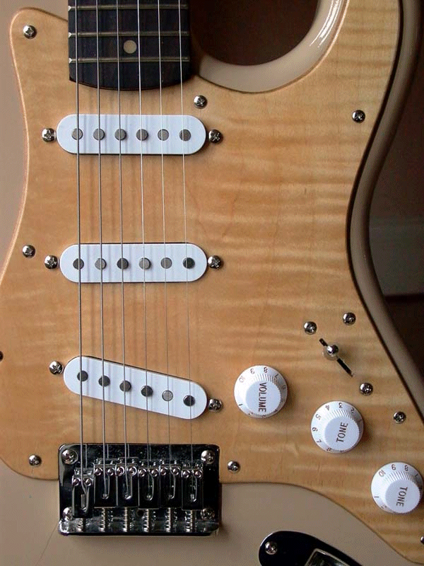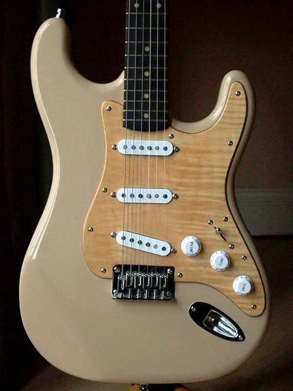 I thought I would try and build myself a quality guitar (and) re-built a 25-year-old strat copy as a practise run. The body is the only original part, and has undergone a fair bit of modification (half inch radius rounding, ash infill of tremolo/bridge cavities). The body shape is very slightly
