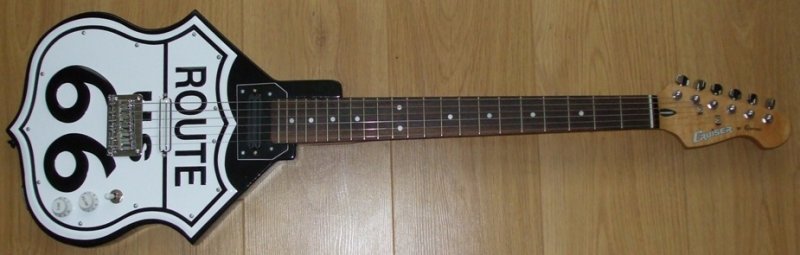 Strat- I bought this bullet strat for next to nothing and decided to do it up.I got a set of Pig Irons and they are absolutely phnomenal for the price. I set them into the red tortoise shell scratchplate and added some cream coloured accesories (tone knobs) etc to give it a 50's rock n roll kind of feel. I plan to put a new maple neck on it as the current fretboard is a bit scratchy.